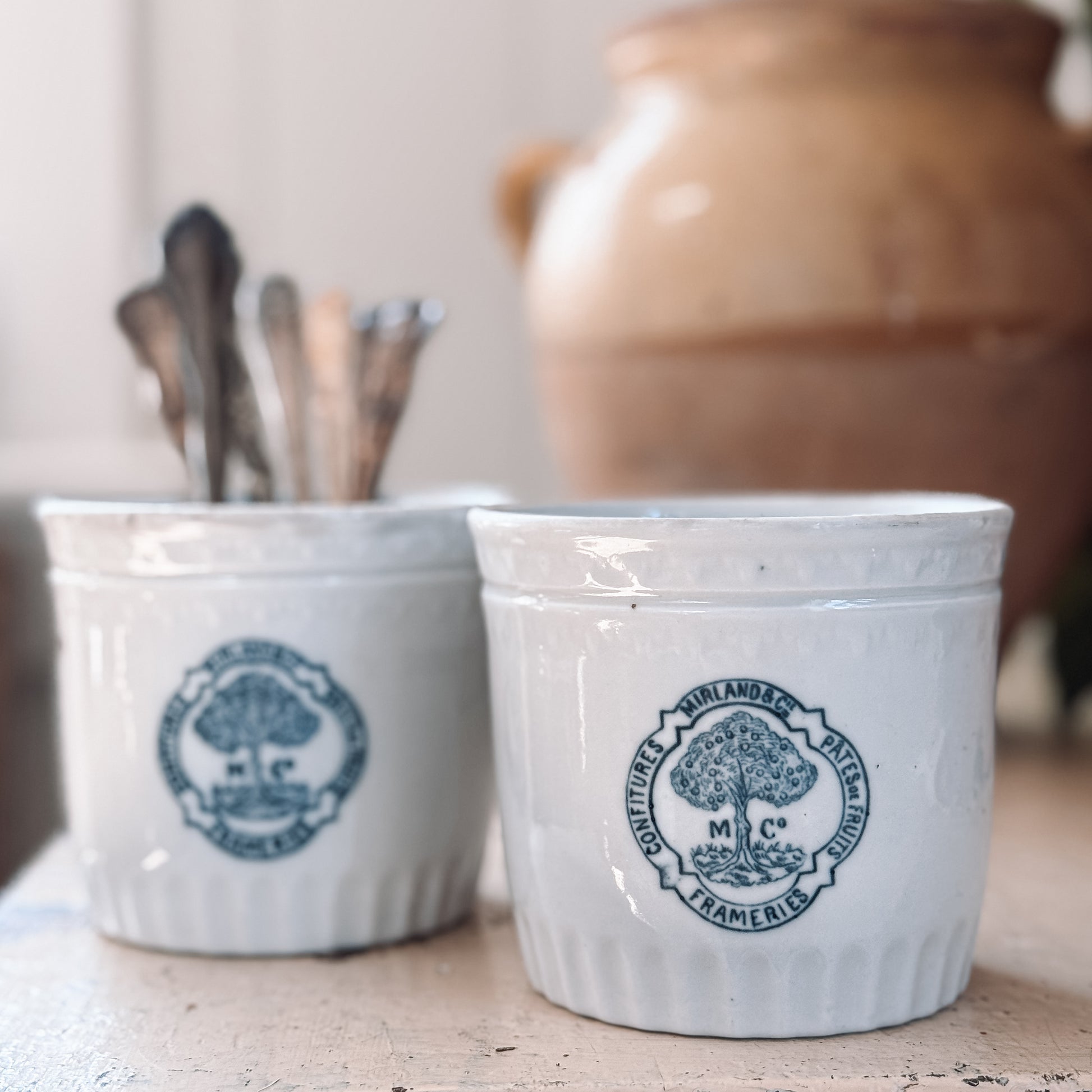 Belgian White Ironstone Jam Pots with Blue Graphics, White Ironstone with slight blue hue