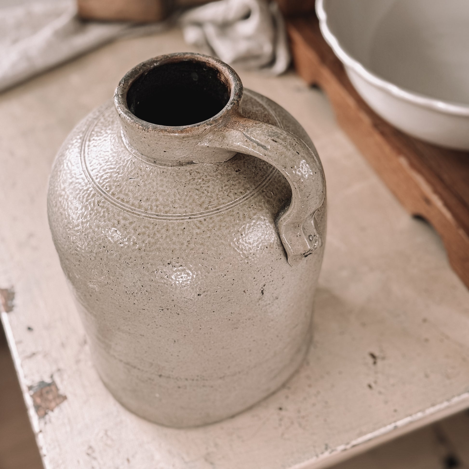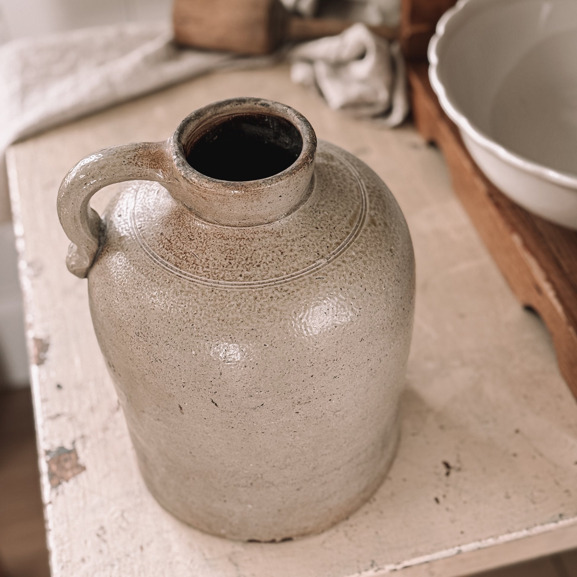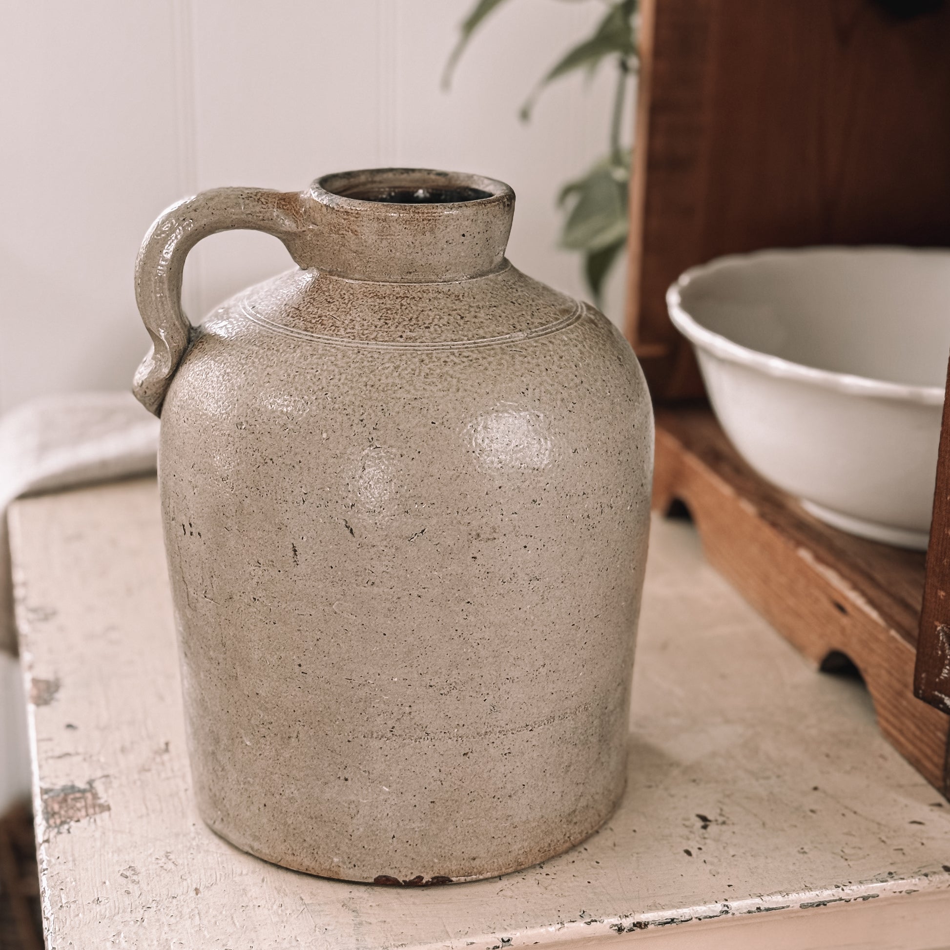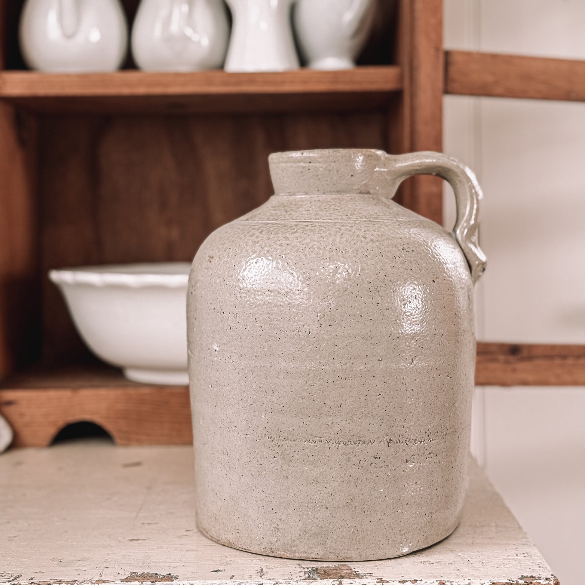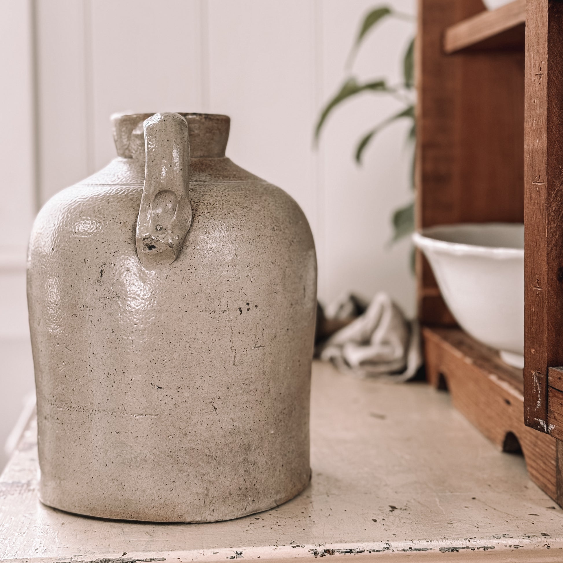 Antique Stoneware Salt Glazed Handled Crock Jug, Tan Colored Jug